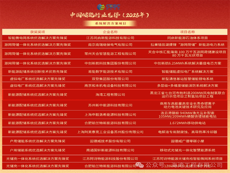 祝贺海湾工程有限公司获得新能源储能系统解决方案先锋奖!